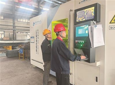 华阳集团宏厦三建钢结构分公司3号车间,工人正在激光切割机电脑前输入编辑好的图纸。本报记者 郭强 通讯员 赵墨 摄